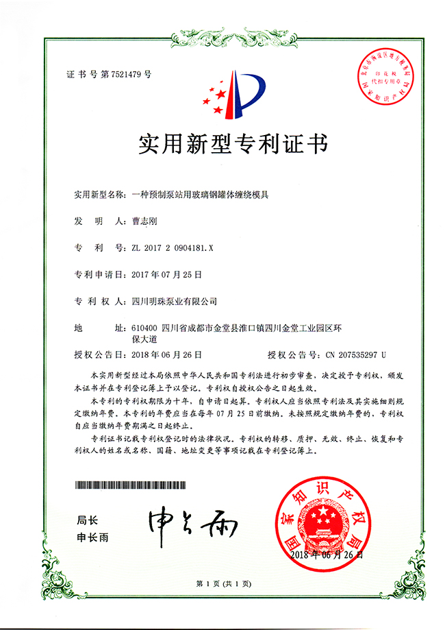 《一种新型玻璃钢预制泵站》实用新型专利证书