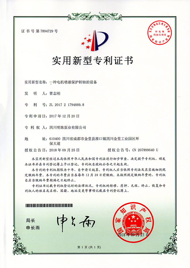 《一种砂浆泵装置》实用新型专利证书